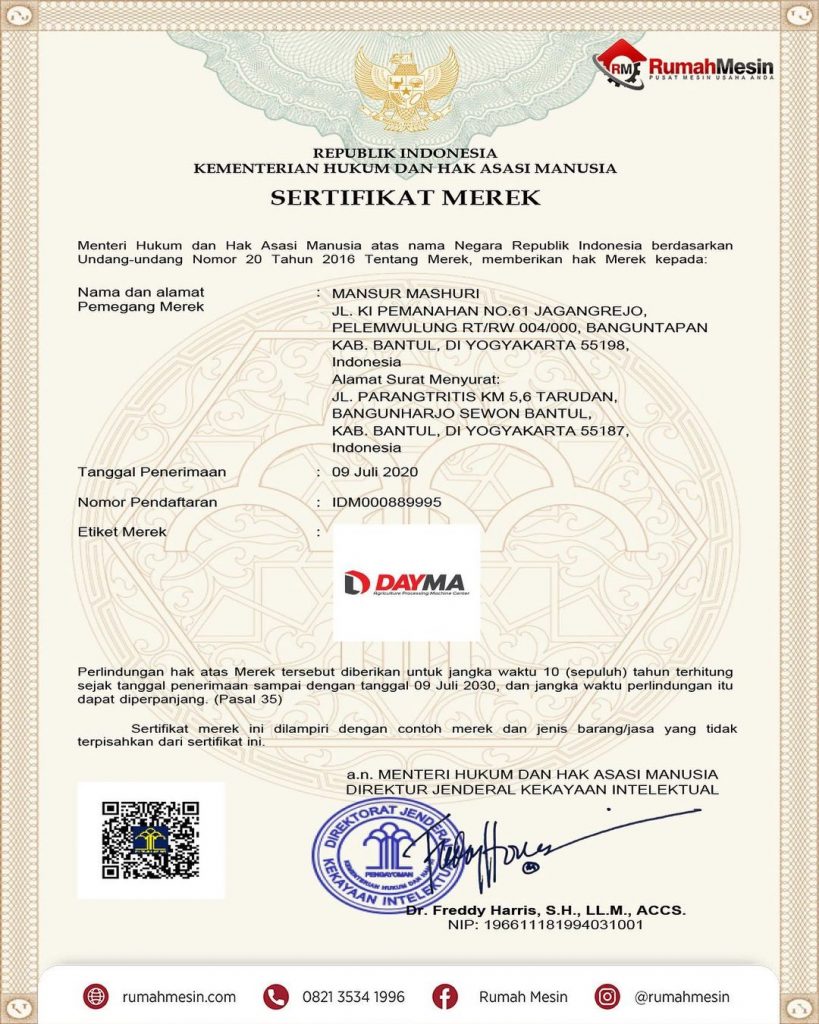 Yogyakarta. CV Rumah Mesin merilis merek baru (Dayma Mesin) yang resmi disahkan langsung oleh Kementerian Hukum dan Hak Asasi Manusia Republik Indonesia sejak 9 Juli 2020. Peluncuran ini disyukuri bersama oleh tim staff dan manajemen CV Rumah Mesin dengan diadakannya syukuran. Dengan adanya Peluncuran merek produk ini diharapkan produk dari CV Rumah Mesin dapat bersaing…..