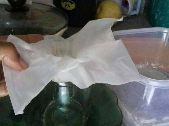 Cara 9 : Siapkan botol bersih yg dibagian atasnya diisi corong berlapis kain saringan atau tissue tanpa parfum. Sendok minyak perlahan lalu tuang kesaringan. Biarkan minyak menetes perlahan kedalam botol. Bagian ini bagi saya adlh bagian tersulit dari keseluruhan prosesnya? sabar dan hati”