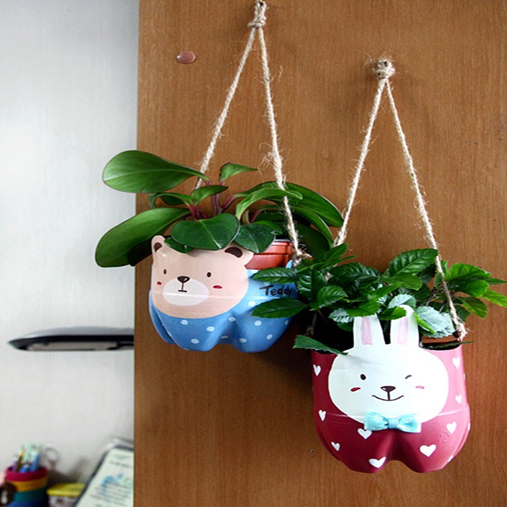 Dengan sedikit sentuhan warna dan gambar – gambar hasil cat hias yang lucu. Kita bisa menggambar apapun sesuai selera di samping – samping botol yang bisa menjadi pot gantungan lucu yang di gantung dalam rumah.