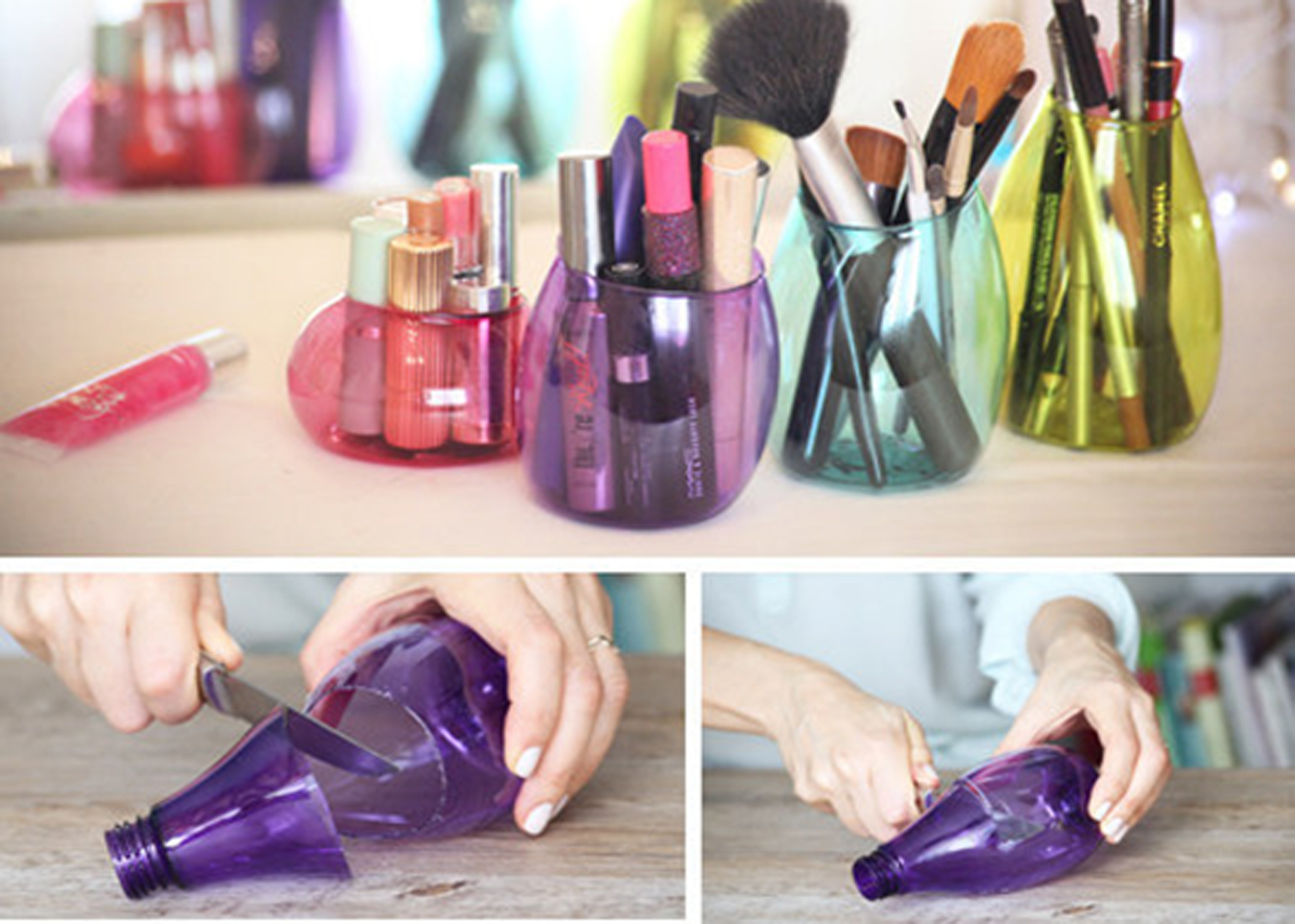 Wadah tempat alat rias membuat meja rias akan lebih rapi tidak berantakan, dengan menggunting ujung botol mineral, lalu bakar sedikit ujung – ujungnya agar lebih mengerut supaya terlihat elegan saat anda sedang mempercantik diri.