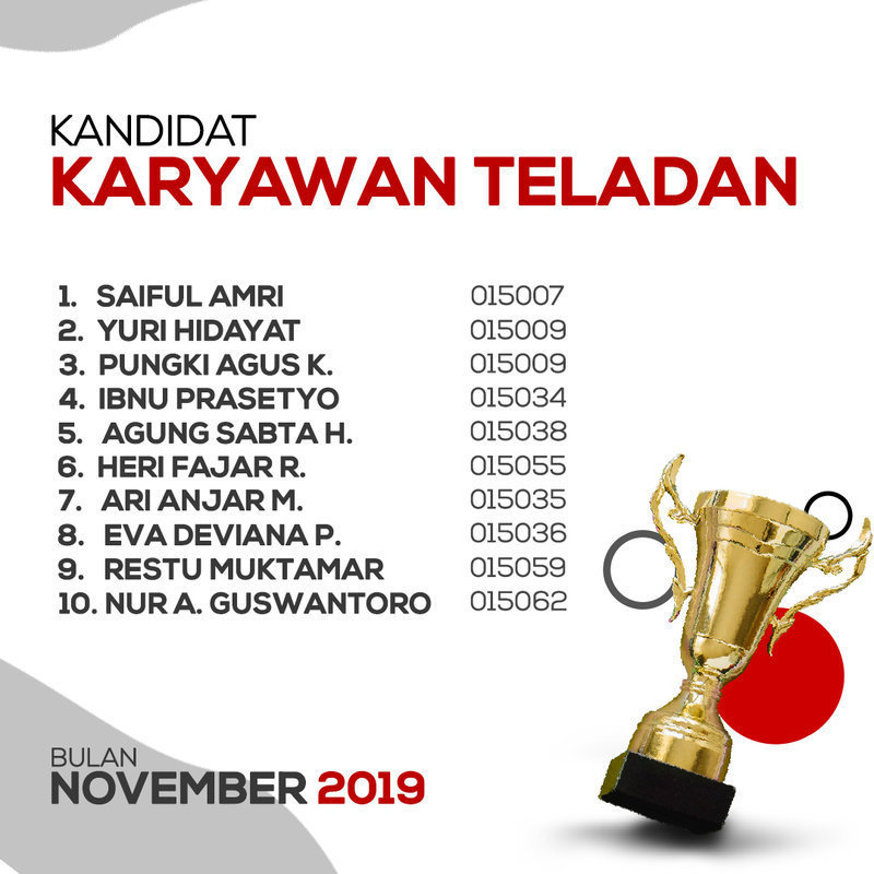 Sepuluh kandidat atau nominasi yang masuk “Karyawan Teladan” tersebut antara lain Syaiful Amri, Yuri Hidayat, Pungki Agus Kurniawan, Ibnu Prasetyo, Agung Sabta H, Heri Fajar R, Ari Anjar Ma’ruf, Eva Deviana P, Restu Muktamar, dan Nur A. Guswantoro.