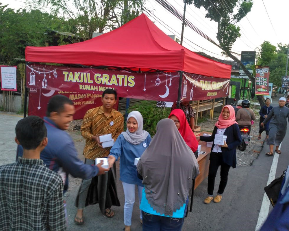 Rumah Mesin membagikan takjil gratis setiap hari Senin sampai dengan Jum’at kepada pengendara yang melewati halaman depan kantor Rumah Mesin di sekitaran Jalan Parangtritis km 5,6 Sewon, Bantul, Yogyakarta. Pembagian takjil gratis tersebut sudah berlangsung sejak hari pertama puasa yakni Senin, 6 Mei 2019.